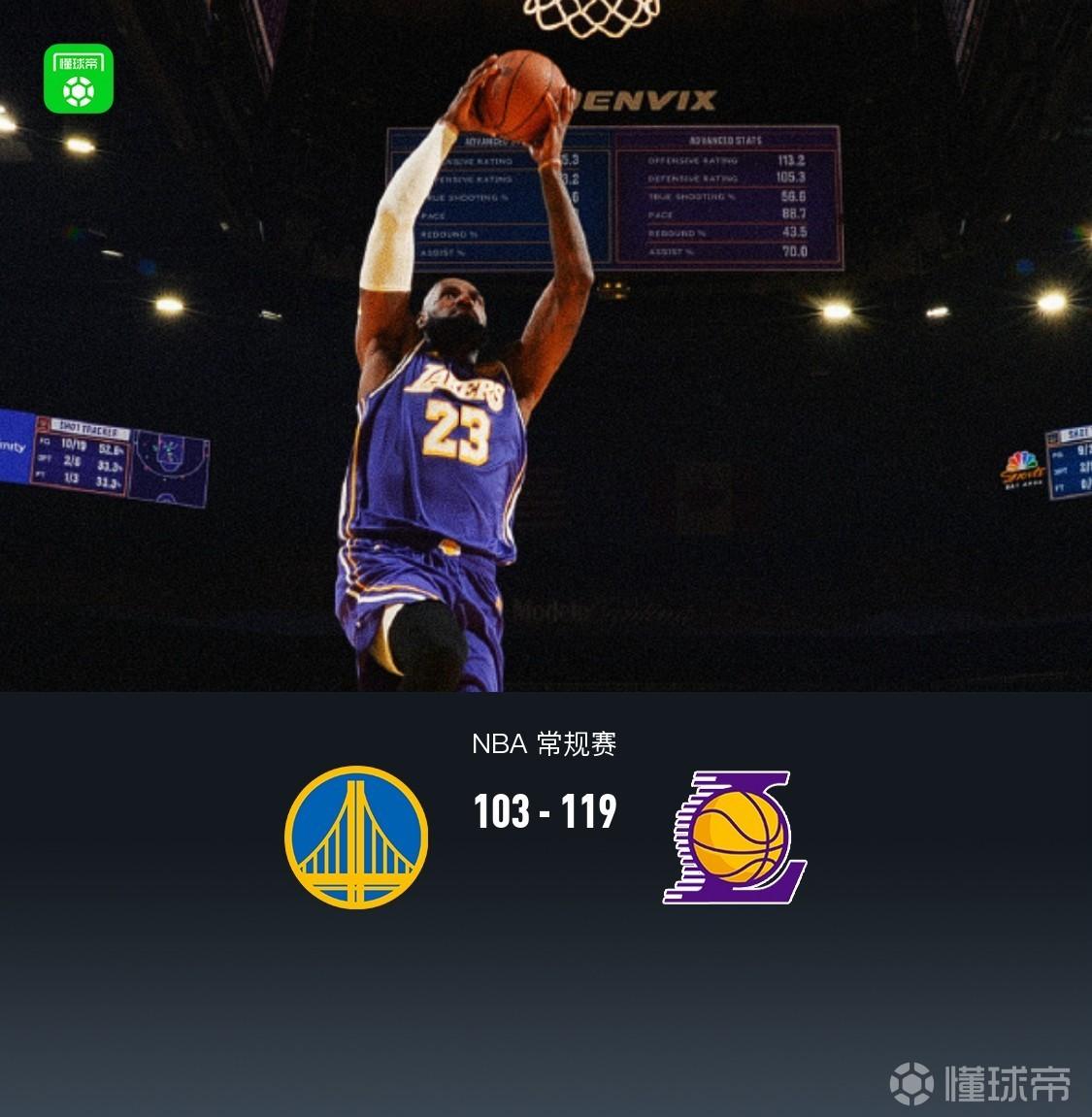 北京时间4月10日NBA 常规赛,金州勇士对阵洛杉矶湖人。本场勇士库里缺阵。上半场双方紧咬比分,半场勇士49-53湖人,下半场湖人逐渐将分差拉大,最大领先27分,最终湖人119-103轻取勇士。